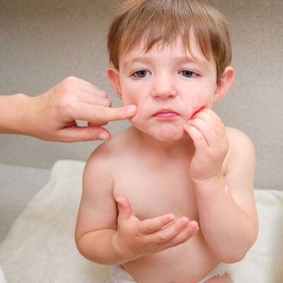 - des rougeurs, caractérisées par des petites plaques rouges (notamment autour des lèvres) ;